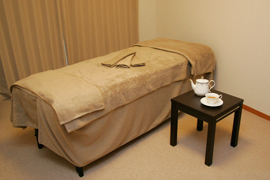 落ち着いた空間のトリートメントルーム。 個室のトリートルームなので、プライバシーも安心です。